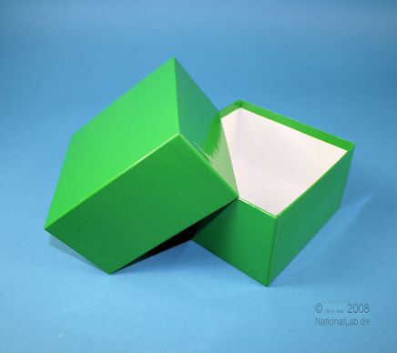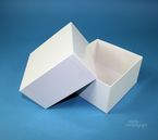 Einfrier- und Lagerboxen. Standardausführung aus tiefkältebeständigem, wasserfest bezogenem Kartonmaterial. Ausführung >spezial< mit wasserdichter Kunststoffbeschichtung. Mit verlängertem Deckel. Außenmaße 133 x 133 mm. Höhe = Innenhöhe.